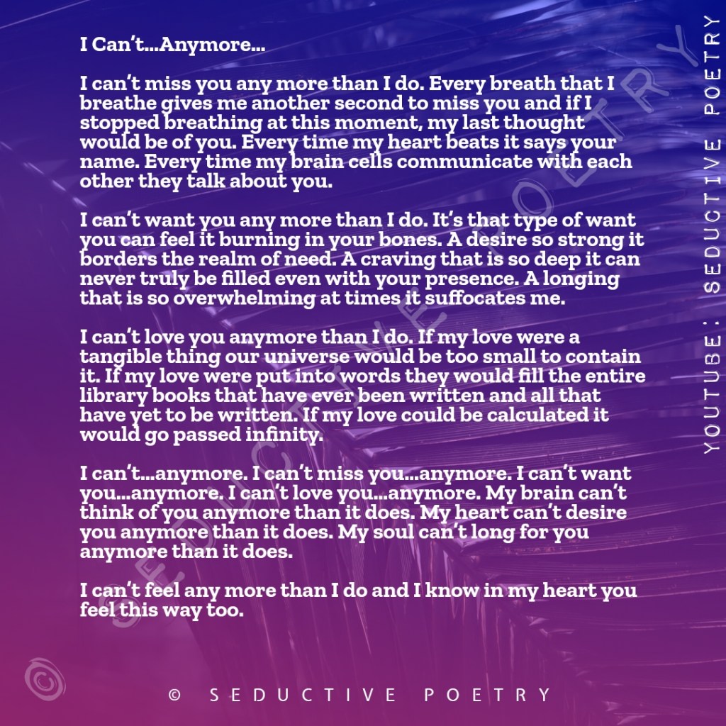 I can’t…anymore. I can’t miss you…anymore. I can’t want you…anymore. I can’t love you…anymore. My brain can’t think of you anymore than it does. My heart can’t desire you anymore than it does. My soul can’t long for you anymore than it does.