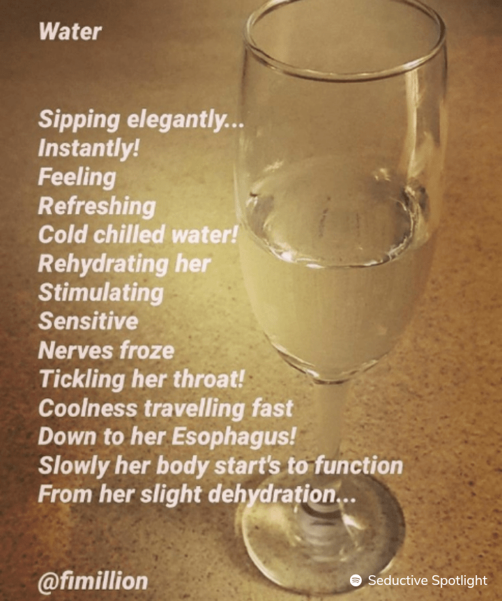 The first is a poem written by @fimillion and was submitted via Instagram for my Seductive Spotlight Poetry Prompt. The prompt was to write a piece using the word “Water”. Here’s the piece.