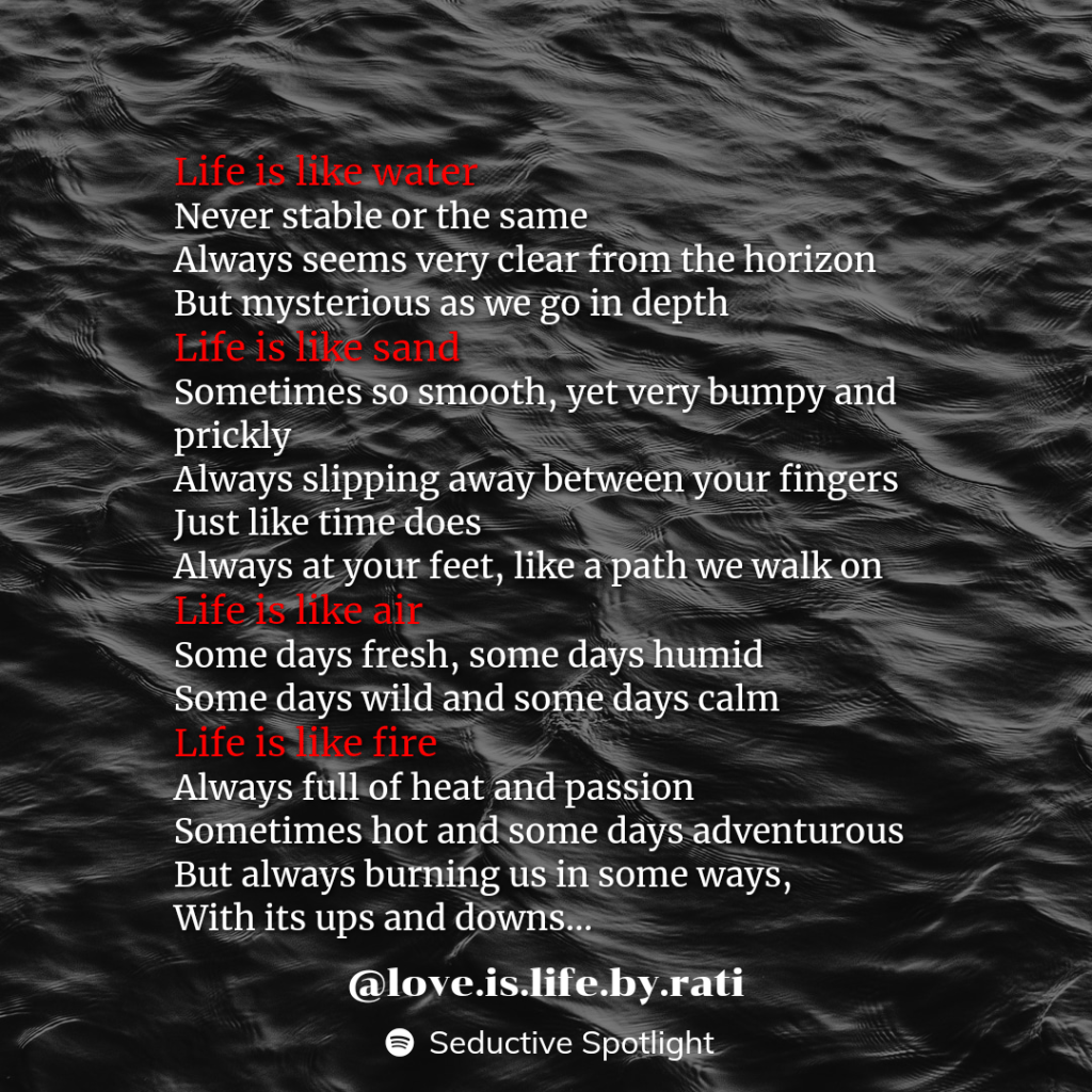 This last one is a poem written by @love.is.life.by.rati and was submitted via Instagram for my Seductive Spotlight Poetry Prompt. The prompt was to write a piece using the word “Water”. Here’s the piece.