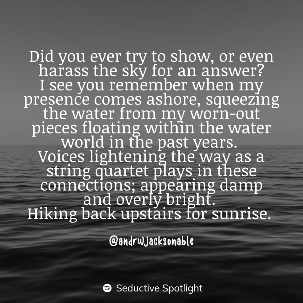 The first is a poem written by @andrwjacksonable and was submitted via Instagram for my Seductive Spotlight Poetry Prompt. The prompt was to write a piece using the word “Water”. Here’s the piece.