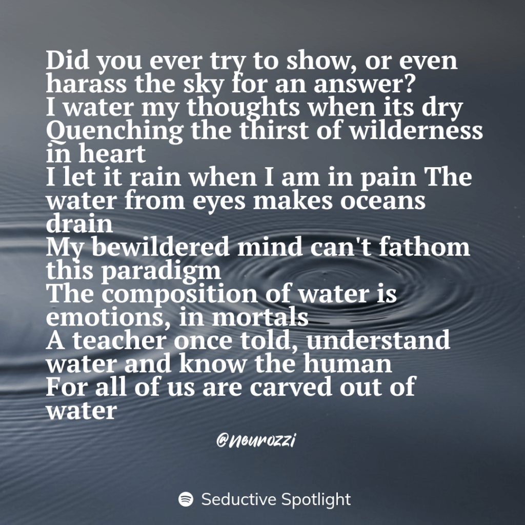 Next is a poem written by @neurozzi and was submitted via Instagram for my Seductive Spotlight Poetry Prompt. The prompt was to write a piece using the word “Water”. Here’s the piece.