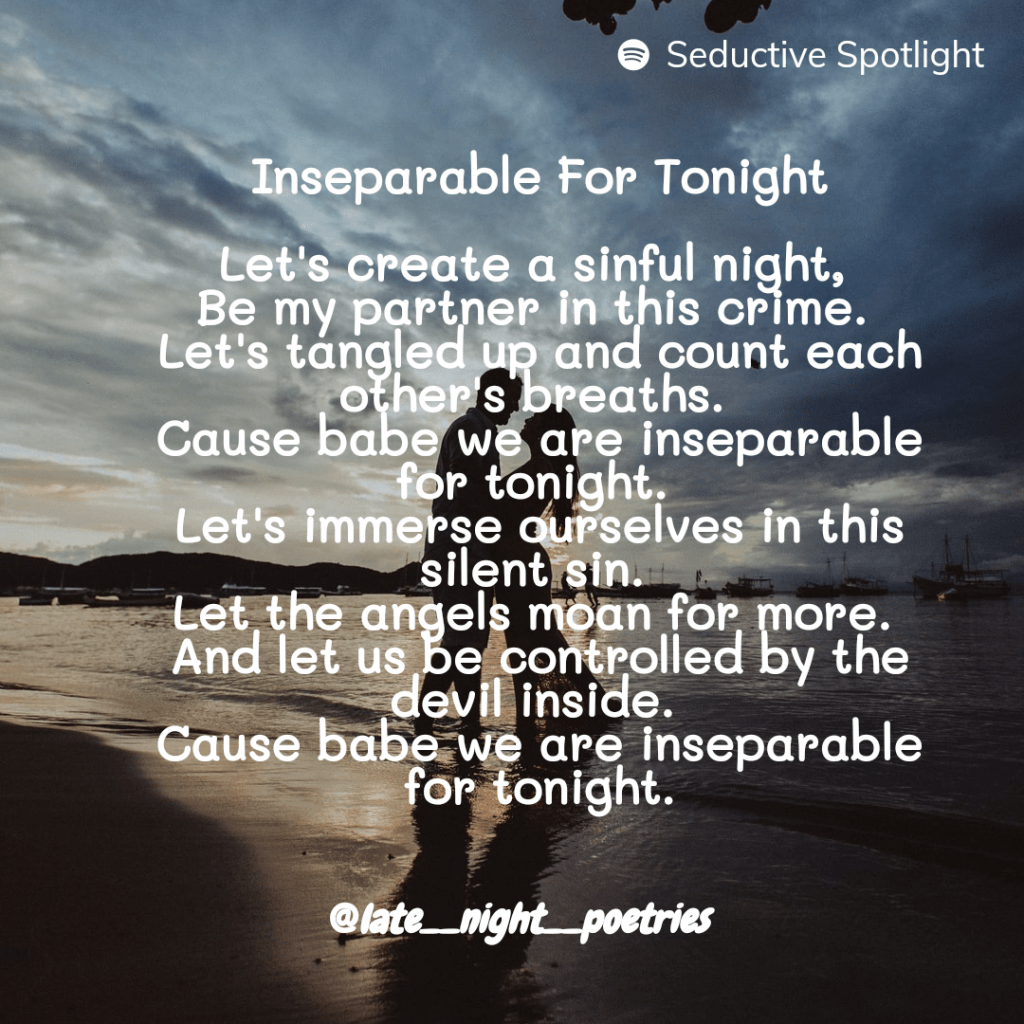 Next is a poem written by @late__night__poetries and was submitted via Instagram for my Seductive Spotlight Poetry Prompt. It’s entitled, Inseparable For Tonight. Here’s the piece.