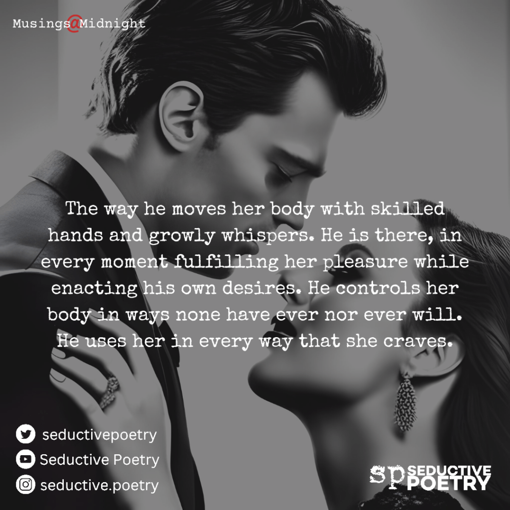 The way he moves her body with skilled hands and growly whispers. He is there, in every moment fulfilling her pleasure while enacting his own desires. He controls her body in ways none have ever nor ever will. He uses her in every way that she craves.