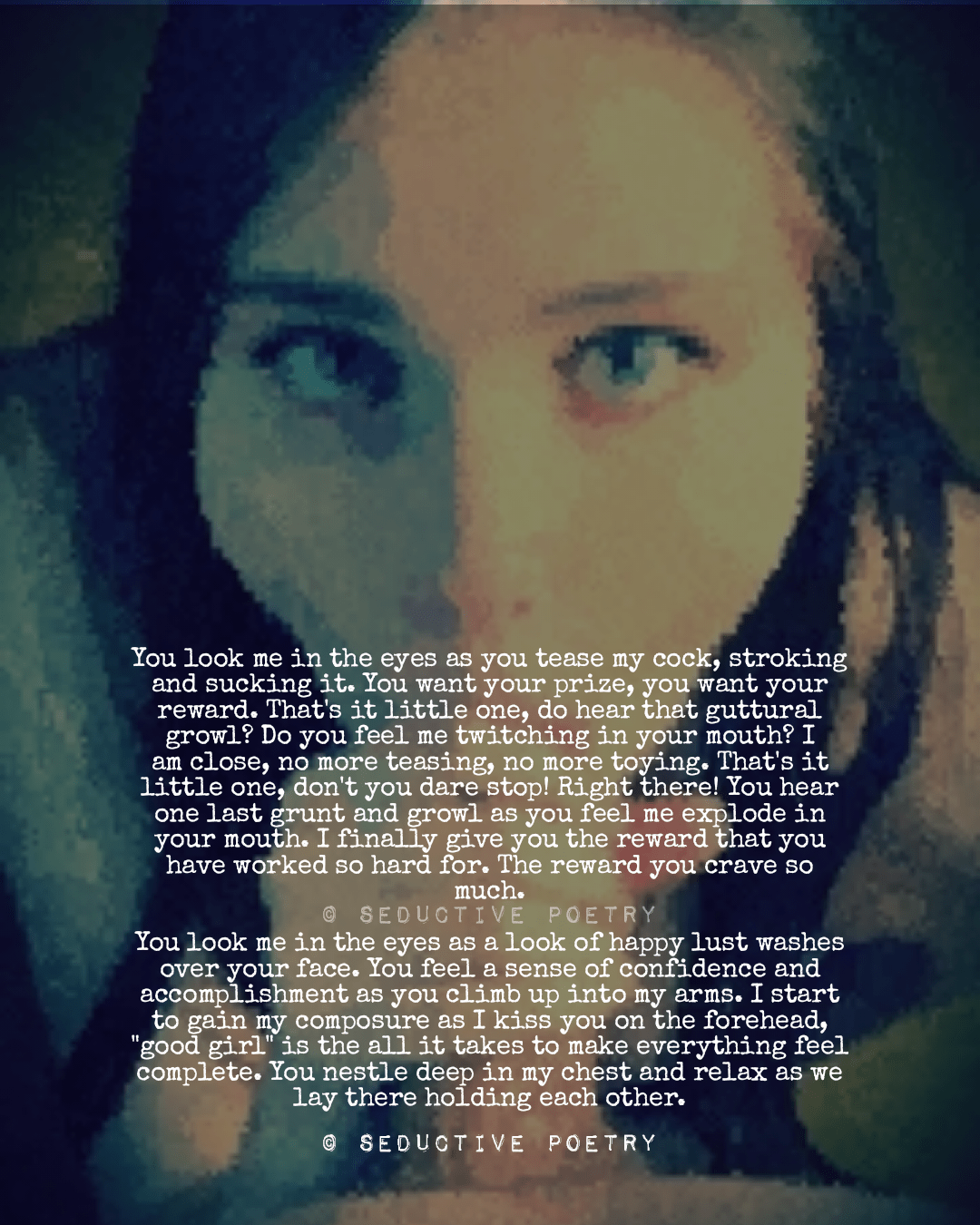 You look me in the eyes you lustful slut. As you worship my cock, taking it deeper in your mouth, sucking it harder with every stroke. You've earned this privilege of worshiping my cock, of having this small window of control. Savor it while you can kitten because this is the only time you will have such a privilege.
